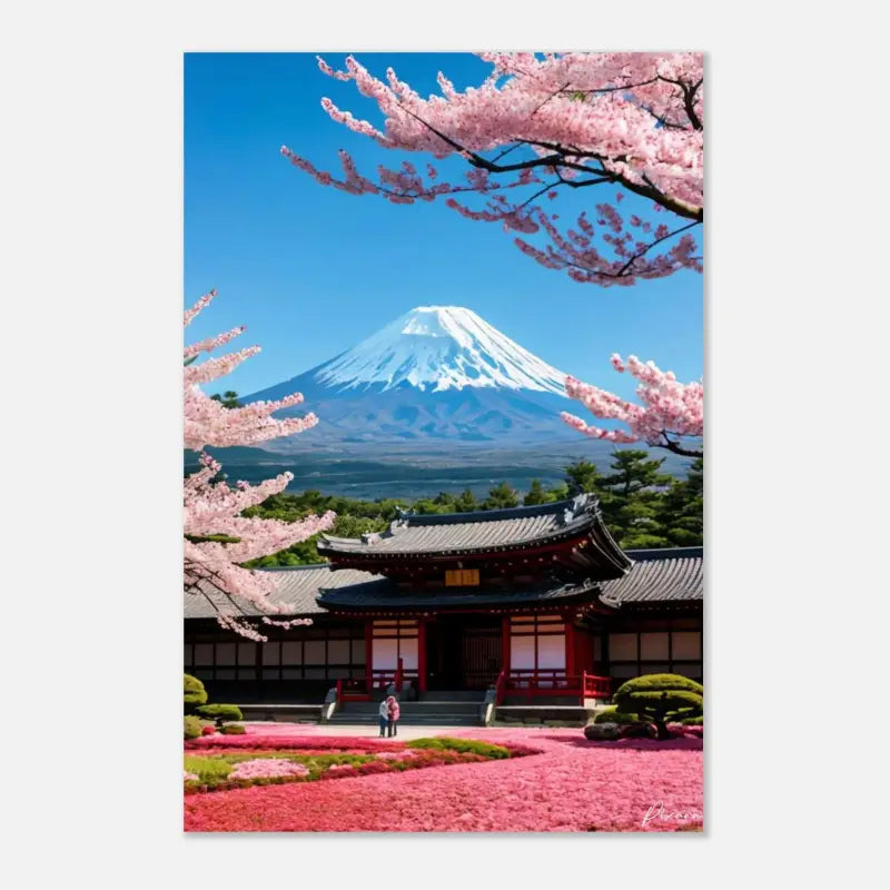 Gönnen Sie sich eine visuelle Reise nach Japan mit diesem eleganten Poster, das den majestätischen Berg Fuji, umrahmt von Kirschblüten, zeigt.