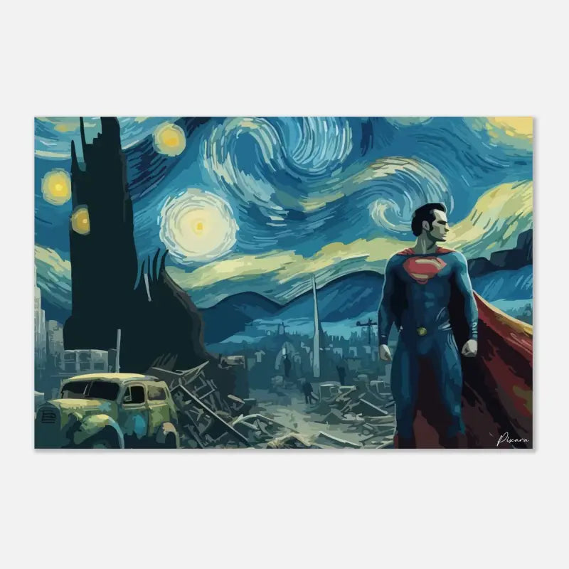 Dieses eindrucksvolle Bild vereint Van Goghs gequälten Himmel mit der ikonischen Figur des Superman , der inmitten der Ruinen ruhig und entschlossen wirkt.