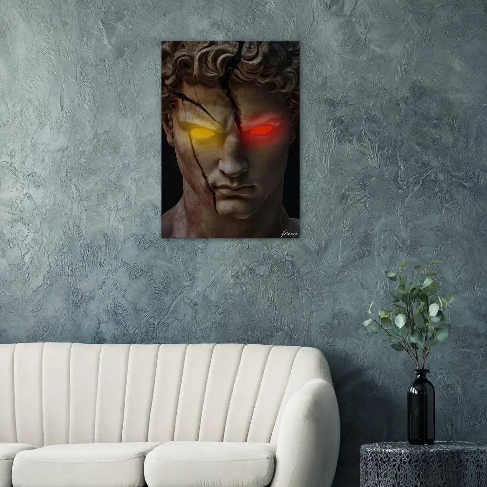 “DIVINITÉ FRACTURÉE” explore la rencontre entre la perfection antique et la puissance moderne. Les yeux, illuminés d’un néon rouge et or, symbolisent la dualité entre la colère et la conscience. Dans le silence du marbre, quelque chose s’éveille.