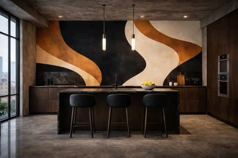 Une fresque panoramique au contraste intense et sculptural. Noir profond architectural, cuivre incandescent et lignes fluides pour un mur signature à l’esthétique galerie internationale.