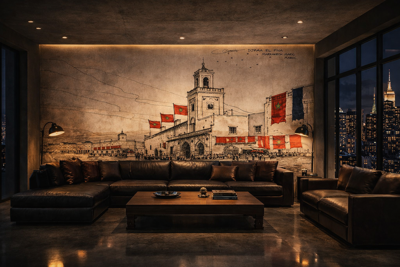 Une fresque monumentale inspirée des tapis marocains ancestraux. Rouge impérial profond, motifs orientaux haute définition et étoile verte centrale pour un mur signature à l’impact architectural puissant.