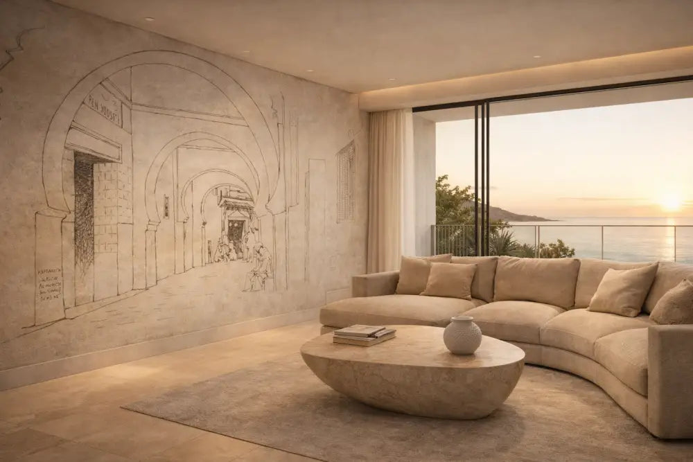 Une succession d’arches et de lignes fines qui créent profondeur, silence et élégance. Une fresque panoramique pensée comme une respiration architecturale.